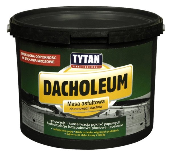 Przerwanie papy nawierzchniowej grozi zawilgoceniem a w rezultacie utratą właściwości termoizolacyjnych dachu i ścian. Dacholeum marki Tytan Professional to masa asfaltowa modyfikowana kauczukiem syntetycznym, która po nałożeniu tworzy trwałą warstwę uszczelniającą odporną na zmienne warunki atmosferyczne, a w szczególności na niszczące działanie mrozu i odwilży. Masa posiada zdolność głębokiego wnikania w podłoże, dzięki czemu ponownie gruntownie uelastycznia papę. Przywraca w ten sposób żywotność papy, utraconą pod wpływem działania niskich i wysokich temperatur, promieni słonecznych czy opadów atmosferycznych. Dodatek kauczuku syntetycznego zapobiega pękaniu masy bitumicznej i gwarantuje, że powstała silnie związana z podłożem powłoka jest elastyczna, kompensuje w pewnym stopniu ruchy podłoża oraz mikropęknięcia. W przypadku konieczności wymiany pokrycia, Dacholeum marki Tytan Professional można używać także do wykonywania samodzielnych powłok hydroizolacyjnych – zarówno bezpapowych jak i na podkładzie z papy. Produkt jest odpowiedni także do wykonywania laminatów zbrojonych włóknem szklanym.