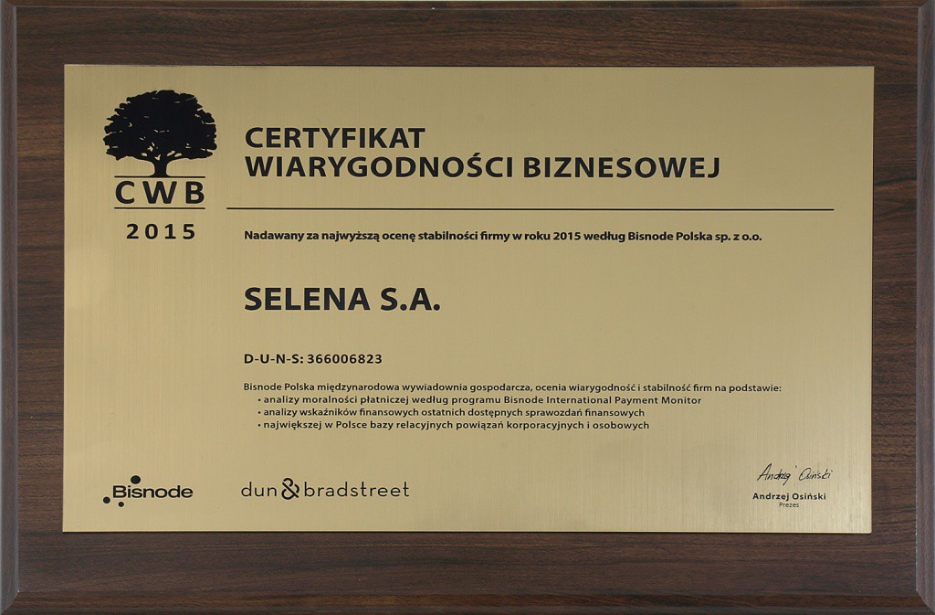 Certyfikatem Wiarygodności Biznesowej nadawanym przez Międzynarodową Wywiadownię Gospodarczą D&B Polska po raz kolejny został wyróżniony producent chemii budowlanej – SELENA SA. Tytuł CWB 2015 to potwierdzenie stabilnej sytuacji firmy i jednocześnie rekomendacja dla potencjalnych partnerów biznesowych.