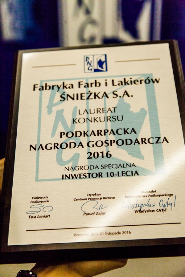 Fabryka Farb i Lakierów Śnieżka SA została wyróżniona prestiżowym tytułem „Inwestora 10-lecia” w ramach konkursu „Podkarpacka Nagroda Gospodarcza 2016”. Świadczy to o jej przynależności do elitarnego grona najprężniej działających podmiotów gospodarczych na Podkarpaciu, stanowi również wyraz uznania Kapituły dla sposobu zarządzania przedsiębiorstwem oraz obranej strategii gospodarczej.