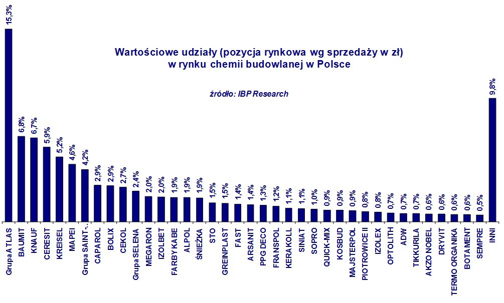 Zdecydowanym liderem rynku chemii budowlanej w Polsce jest Grupa ATLAS (obejmuje też marki: Dolina Nidy, Gipsar, Nowy Ląd, Izohan, Izolmat, Optyzar, WiM) łącznie z 17 %-owym udziałem ilościowym i 15%-owym udziałem wartościowym.