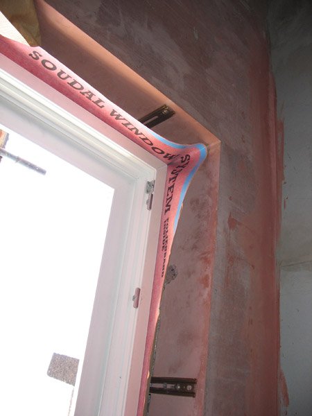 Do wypełnienia szczeliny pomiędzy ościeżnicą a ścianą w domu pasywnym została zastosowana pianka Soudafoam Gun Low Expansion Click & Fix. Warstwa termoizolacji z pianki została zabezpieczona folią paroprzepuszczalną Soudal Folienband Outside.Fot. SoudalW domu pasywnym od strony wewnętrznej zastosowano specjalną folię okienną Soudal z butylem, która została wyklejona na całym ościeżu. Jest ona niezbędna aby zapewnić szczelność złącza i wyeliminować miejsca przenikania pary wodnej do wnętrza przegrody. Do wypełnienia szczeliny pomiędzy ościeżnicą a izolacją termiczną została zastosowana pianka Soudafoam Gun Low Expansion Click & Fix. Okna o dużych gabarytach zmieniają swoje wymiary pod wpływem wahań temperatury, wilgotności lub innych czynników zewnętrznych. Ich montaż wymaga nie tylko wiedzy i wprawy ekipy budowlanej, ale także zastosowania produktów najwyższej jakości. Dlatego tak istotne jest dobranie odpowiedniej piany montażowej, która zabezpieczy okno przed ewentualnymi deformacjami powstającymi w wyniku zmiany rozmiaru profili. Pianka Soudafoam Gun Low Expansion Click & Fix jest materiałem sprężystym, przez co zabezpiecza okno przed deformacją. Cechuje się także niskim współczynnikiem przewodzenia ciepła, prawie tak niskim, jak zastosowany do ocieplenia budynku styropian. Od strony zewnętrznej zaś zastosowano folię okienną i taśmę rozprężną zamykającą od zewnątrz styk ościeżnicy ze styropianem.