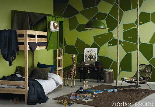 Fot. Tikkurila Dżungla Safari to istny raj dla młodego odkrywcy. Z kolorami natury, można stworzyć w pokoju prawdziwie afrykański klimat. Różne odcienie zieleni z kolekcji Tikkurila Kids Style stworzą charakterystyczny wzór moro. Dodatkowo, motywy zwierzęce i roślinne pozwolą nieco bardziej przybliżyć świat fauny i flory.