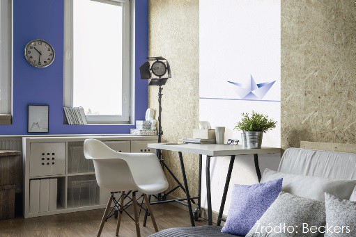 Fot. BeckersJeżeli nie mamy wystarczającej przestrzeni na przeznaczenie osobnego pomieszczenia na biuro, możemy wygospodarować w tym celu na przykład część salonu i wyróżnić tę przestrzeń za pomocą kolorów. Pomalowanie jednej ściany w intensywnym odcieniu będzie nie tylko ciekawym rozwiązaniem, ale i dodatkową dekoracją całego wnętrza. Żywe kolory takie jak Vivid Pink warto stonować spokojnymi odcieniami np. Misty Violet z serii Beckers Designer Colour. Takie zestawienie rozbudzi kreatywność, ale jednocześnie nie będzie zbyt przytłaczające.