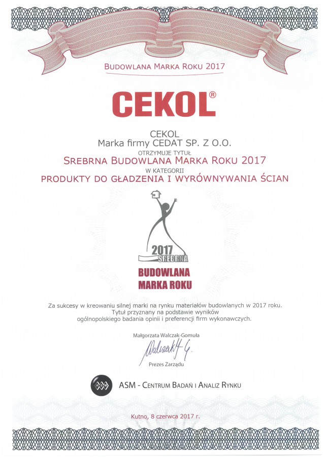 Gładzie CEKOL już po raz kolejny z rzędu zostały docenione i wyróżnione przez wykonawców. Dla naszej firmy jest to bardzo cenne wyróżnienie, gdyż dowodzi to satysfakcji klientów z stosowania naszych produktów oraz jest docenieniem i nagrodą za codzienną pracę wkładaną w jak najwyższą jakość i niezawodność produktów.