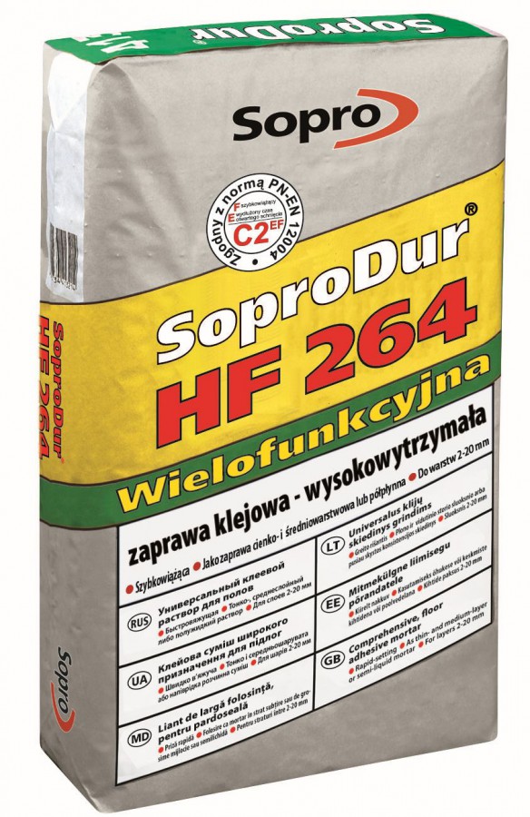 SoproDur® HF 264 to wielofunkcyjna, szybkowiążąca, elastyczna, cementowa zaprawa klejowa z dodatkiem tworzyw sztucznych, charakteryzująca się możliwością bardzo wczesnego obciążania. To produkt, pod wieloma względami, wielozadaniowy. Po pierwsze, doskonale sprawdzi się w przypadku współpracy z różnorodnymi materiałami okładzinowymi - płytkami i płytami ceramicznymi, kamionkowymi, gresowymi, płytami Cotto, podłogowymi płytami klinkierowymi, płytami z betonu i niewrażliwego na przebarwienia kamienia naturalnego oraz płytami z konglomeratów, wytworzonych na bazie żywicy syntetycznej. Po drugie, może być używany do układania płytek metodą półpłynną lub średniowarstwową do 20 mm, na podłogach ogrzewanych oraz na istniejących okładzinach metodą „płytka na płytkę”. Po trzecie, cechuje go szeroki wachlarz zastosowań - SoproDur® HF 264 przyspieszy pracę zarówno podczas dużych, jak i niewielkich inwestycji. Dzięki wysokokrystalicznemu wiązaniu wody i możliwości zastosowania zaprawy w konsystencji półpłynnej, jest szczególnie zalecany do użycia w obiektach przemysłowych i użyteczności publicznej, których posadzki narażone są na duże obciążenia lub oczekiwane jest szybkie, ponowne użytkowanie okładziny.