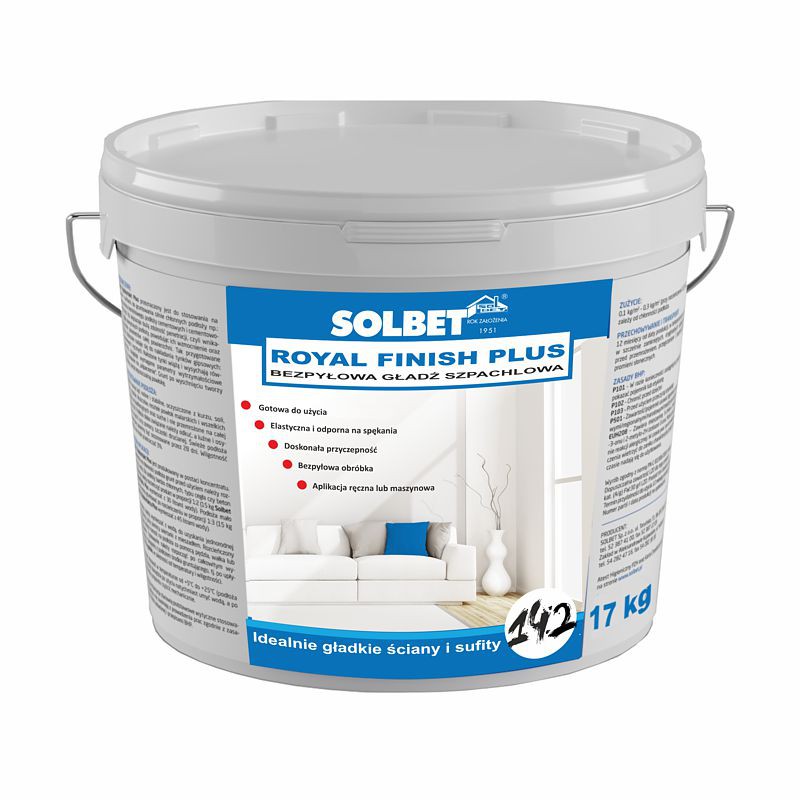 Fot. SolbetSOLBET ROYAL FINISH PLUS 14.2 to gotowa bezpyłowa gładź na spoiwie organicznym, przeznaczona do ostatecznego wygładzania ścian i sufitów wewnątrz budynków przed malowaniem i tapetowaniem. Idealnie gładką ścianę uzyskuje się poprzez delikatne docieranie powierzchni po jej uprzednim zwilżeniu wodą. Dużą zaletą tego rozwiązania jest możliwość wygładzania bez uciążliwego pyłu. Gładź ROYAL FINISH cechuje wysoka elastyczność i odporność na spękania. Może być stosowana na wszystkie mineralne, suche, nośne podłoża takie jak: beton, wysezonowane tynki cementowe, cementowo-wapienne i gipsowe oraz płyty gipsowo-kartonowe, wolne od substancji obniżających przyczepność. Gładź przeznaczona jest do nanoszenia ręcznego i maszynowego. Dostępna pojemność: 17 kg