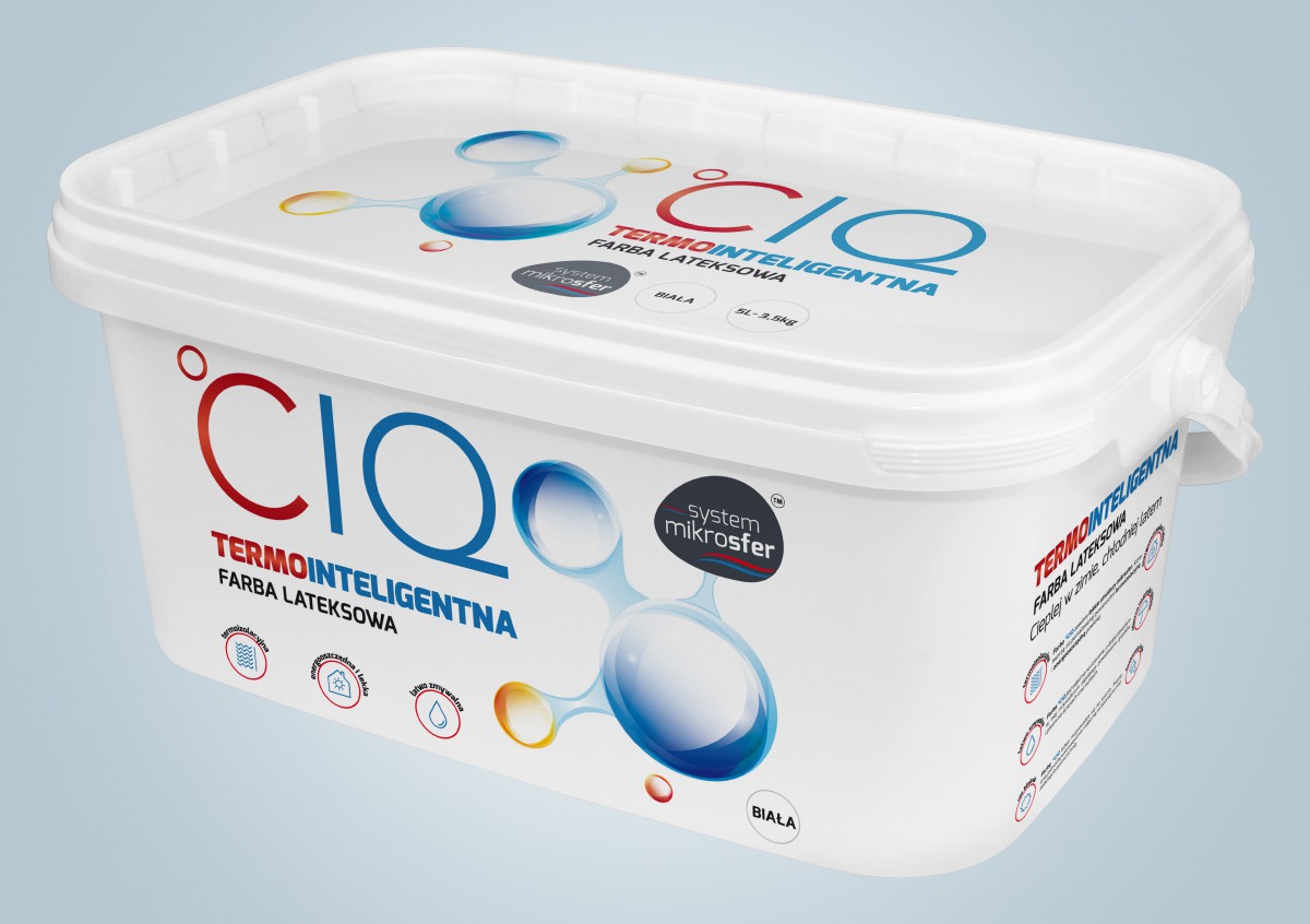 Farba CIQ, Fot. CIQCIQ to zaawansowana technologicznie farba termointeligentna bardzo wysokiej jakości. Tym, co zdecydowanie odróżnia CIQ od farb dostępnych na rynku, są termoizolacyjne właściwości tego produktu. Dzięki zastosowanemu w niej nowemu systemowi mikrosfer, farba CIQ ma bardzo wysokie zdolności odbijania promieniowania cieplnego – a to sprawia, że produkt zatrzymuje ciepło zimą i ogranicza nagrzewanie pomieszczenia latem. CIQ najskuteczniej spośród farb dostępnych na rynku, izoluje ściany budynku – ściana pokryta farbą CIQ odbija aż do 95% promieniowania cieplnego. Termoizolacyjne właściwości farby przekładają się na zauważalną oszczędność kosztów ogrzewania domu.Nowa farba CIQ doskonale kryje, tworząc na ścianach i sufitach wyjątkowo trwałe powłoki o przedłużonej żywotności, odporne na wielokrotne zmywanie, a także na grzyby i pleśń. Dodatkowo jest prosta w użyciu – bardzo łatwo rozprowadza się na ścianie, a pomalowana nią powierzchnia staje się przyjemna i ciepła w dotyku. CIQ wyróżnia również doskonała elastyczność, która ogranicza powstawanie rys i pęknięć.