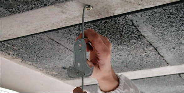 Konstrukcję sufitu podwieszanego podtrzymują wieszaki kotwowe, mocowane do stropu przy pomocy metalowych kołków sufitowych (zdjęcie 3). Odstępy i rozstaw wieszaków zależą od rodzaju i ciężaru planowanej zabudowy. I tak np. przy całkowitym ciężarze zabudowy sufitu, tj. konstrukcji, izolacji i płyty, do 15 kg/m2 rozstaw wieszaków wynosi 1 m. Skomplikowany kształt i ciężka zabudowa wymagają odpowiednio większego zagęszczenia.