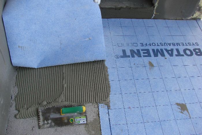 W następnych krokach powinniśmy zagruntować przygotowaną wcześniej warstwę spadkową. Możemy do tego użyć sprawdzonego środka, jakim jest BOTAMENT® D 11. Teraz możemy zabrać się za zabezpieczenie najbardziej problematycznych elementów balkonu lub tarasu – połączenia z nisko osadzonymi oknami lub drzwiami warto wykonać przy pomocy taśmy uszczelniającej BOTAMENT® Portalband, natomiast narożniki wewnętrzne można również zabezpieczyć taśmą BOTAMENT® SB 78. Powierzchnię tarasu lub balkonu przeciwwodnie zabezpieczamy układając matę uszczelniająco-kompresującą BOTAMENT® AE za pomocą zaprawy klejowej BOTAMENT M 21 (M 21 HP) lub BOTAMENT M 10 Speed. W połączeniu z szybkowiążącą zaprawą klejową BOTAMENT® M 10 Speed możliwe jest układanie płytek już po około 90 minutach od przyklejenia maty nawet przy temperaturze obróbki +3 stopni C – to rozwiązanie szczególnie zalecane jest wczesną wiosną oraz późną jesienią.