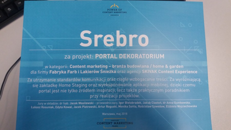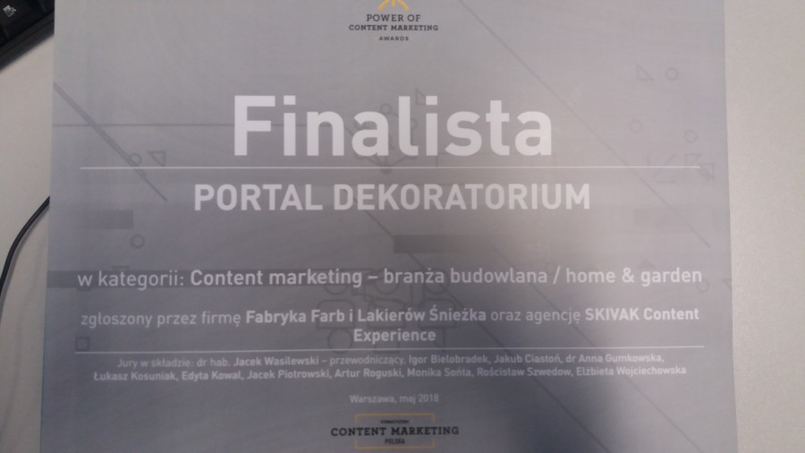 23 maja przyznane zostały nagrody w konkursie „Power of Content Marketing Awards”, znane do tej pory jako Szpalty Roku. Wśród laureatów znalazła się FFiL Śnieżka SA, która w kategorii Content Marketing Branża Budowlana / Home & Garden otrzymała srebrną statuetkę za portal Dekoratorium.