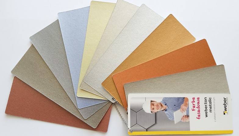 Farba metaliczna weber.ton metalic. Fot. WeberFarba weber.ton metalic gwarantuje wyjątkowe wykończenie fasady połyskującym, metalicznym efektem. 10 kolorów w palecie kolorystycznej imituje kolorystykę materiałów industrialnych, takich jak miedź, aluminium, brąz, mosiądz czy metal. Paleta zawiera aż pięć odcieni metalu o różnym nasyceniu srebrzystym błyskiem. „Dla tych, którzy poszukują bardziej naturalnych odcieni, również mamy propozycję w naszej ofercie. To dwa odcienie: nasyconego błękitu i delikatnej seledynowej zieleni. Wszystkie świetliste kolory farby metalicznej świetnie podkreślą wybrane elementy elewacji czy detale architektoniczne. Wyrazisty, połyskujący fragment będzie dobrze widoczny na tle jednolitych ścian”, mówi Krzysztof Siemak, kierownik produktu systemy fasadowe Weber.