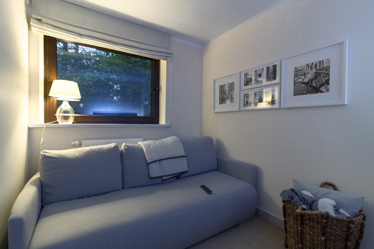 Kanapa powinna być przede wszystkim miękka i wygodna, z poduszkami, dla wyjątkowo wygodnickich może być z dodatkowymi pufami do położenia nóg podczas oglądania. Bardziej przemyślaną w formie, z szykownymi przeszyciami, modnymi skośnymi nóżkami postaw raczej w salonie, gdzie masz szansę wprowadzić designerski akcent i nadać wnętrzu indywidualny styl. Zrezygnuj również z ciężkiej szafy przytłaczającej wnętrze na rzecz niskich szafek,w których możesz schować kolekcję filmów.
