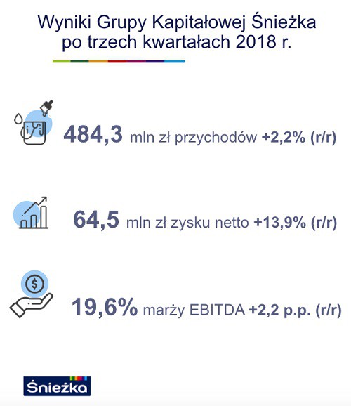 Grupa Kapitałowa Śnieżka w ciągu trzech kwartałów 2018 roku wypracowała wyższe przychody ze sprzedaży niż rok wcześniej – głównie dzięki popytowi w Polsce i na Ukrainie. Za ten okres osiągnęła także najwyższe w swojej historii zyski na działalności operacyjnej i netto. W kolejnych miesiącach spodziewane jest utrzymanie popytu na produkty z segmentu premium, a także ze średniej półki cenowej.
