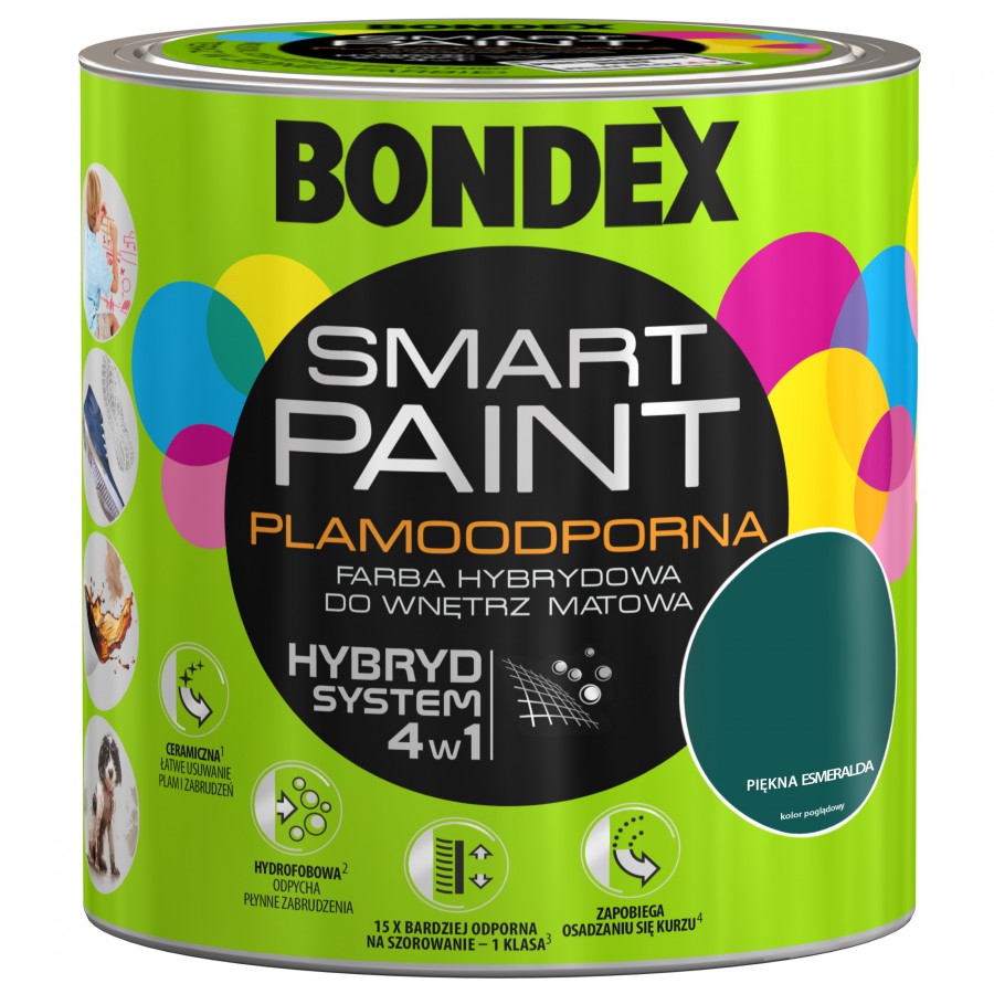 Bondex Smart Paint to najwyższej jakości plamoodporna farba hybrydowa o matowym efekcie wykończenia z innowacyjną formułą HYBRYD SYSTEM 4w1. Ceramiczna – trwała i odporna powłoka zapobiega absorbowaniu plam i zabrudzeń, a ich usuwanie jest niezwykle łatwe. Hydrofobowa – odpycha płynne zabrudzenia zapobiegając powstawaniu plam. 15 x bardziej odporna na zmywanie i szorowanie niż standardowe farby wg polskiej normy – klasa 1. Zapobiega osadzaniu się kurzu – formuła nie zawiera substancji przyciągających kurz, minimalizując przywieranie zabrudzeń z powietrza do malowanej powierzchni. Doskonała aplikacja – wysoka siła krycia, nie chlapie podczas malowania. Hypoalergiczna – przyjazna dla alergików i osób szczególnie wrażliwych; Z maksymalnie obniżoną zawartością rozpuszczalników organicznych. Wysoka trwałość powłoki i kolorów bez zmian matowego wykończenia powierzchni.