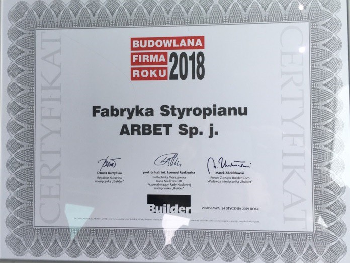 Fot. ArbetBudowlana Firma Roku to wyróżnienie przyznawane przez Redakcję, Radę Naukową i Programową miesięcznika Builder firmom z branży budowlanej. Promowaną wartością jest dynamiczny rozwój i osiągnięta pozycja na rynku budowlanym. Menadżerów tych firm Builder wyróżnia za skuteczne zarządzanie i sukcesy rynkowe.