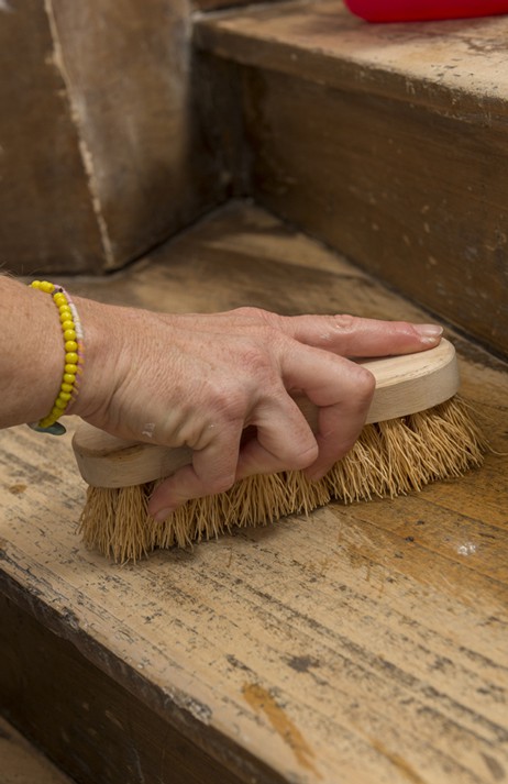 Przyjrzyj się powierzchni zastanej – farby z linii renowacja można śmiało nakładać na drewno lakierowane i malowane oraz na panele podłogowe, nie należy ich natomiast stosować na drewno olejowane i woskowane. Jeżeli nic nie stoi na przeszkodzie dalszej renowacji, możesz przejść do pierwszego i najistotniejszego etapu, jakim jest skrupulatne przygotowanie podłoża. Konieczne będzie zaopatrzenie się w szczotkę o sztywnym włosiu, która posłuży do usunięcia łuszczących się warstw starej farby. Następnym krokiem jest porządne umycie schodów za pomocą gąbki i środka czyszczącego na bazie sody.