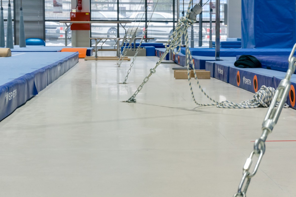 Fot. FlowcreteFlowshield LXP to gładka i elastyczna posadzka typu wylewanego, która powstaje na bazie barwionej żywicy poliuretanowej. Wysokie parametry w zakresie odporności na ścieranie sprawiają, że system ten doskonale sprawdza się w pomieszczeniach o dużym natężeniu ruchu. Jej bezspoinowa, nienasiąkliwa powierzchnia, jest łatwa w czyszczeniu i umożliwia zachowanie wysokiego poziomu higieny, co ma szczególne znaczenie w pomieszczeniach, w których odbywają się intensywne treningi fizyczne. Dodatek drobnych, kolorowych płatków nadaje posadzce bardziej dekoracyjny charakter. Stanowi ona subtelne tło dla ułożonych na niej materacy i innych elementów wyposażenia hali.