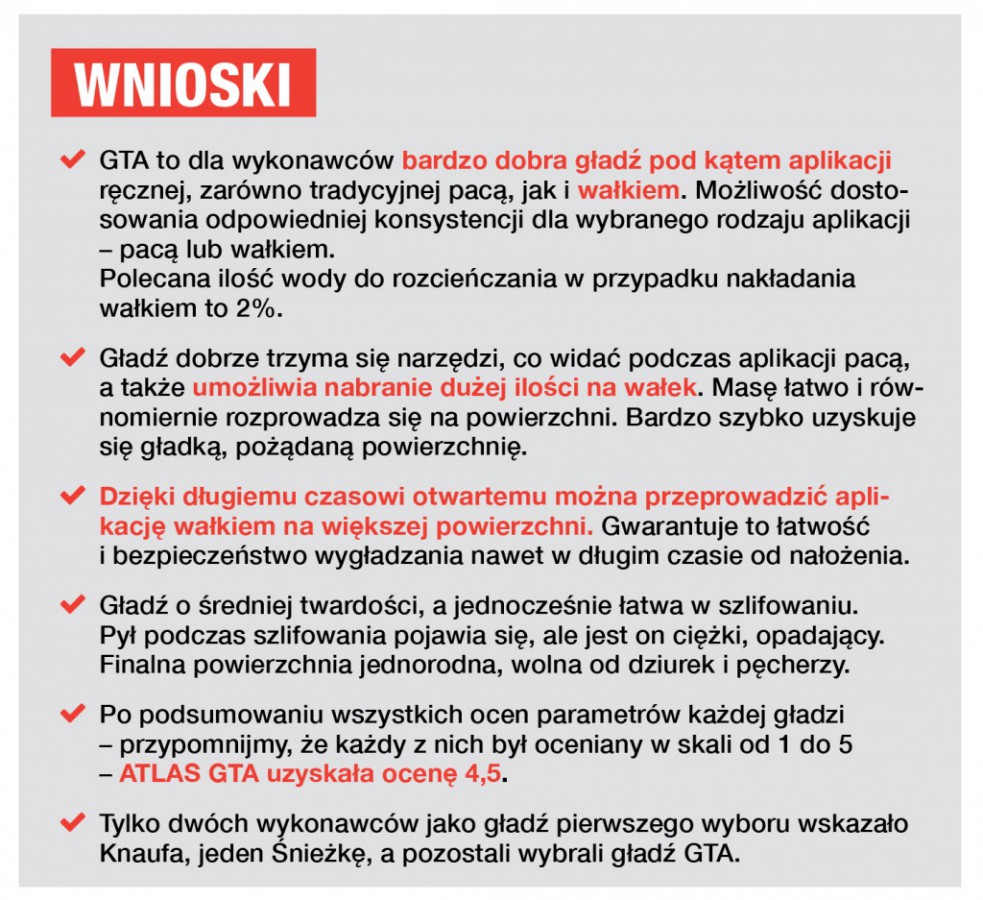 W opinii wykonawców dobra pod względem szlifowania jest taka gładź, która ma optymalną twardość. To znaczy, że nie trzeba wkładać w jej szlifowanie dużej siły, więc nie jest zbyt twarda. Zbyt miękka gładź sypie się, co skutkuje dużym pyleniem podczas szlifowania. Po przeszlifowaniu faktura gładzi jest równa, gładka i jednolita. GTA została oceniona wysoko (szlifowanie 4,5) i choć nwięcej pyliła, to pył był ciężki i opadał. Praca nie wymagała użycia dużej siły. Najgorzej wypadł Cekol A-45 ze względu na ciężką obróbkę związaną z twardością gładzi (szlifowanie 3,9), natomiast bardzo mało pylił.