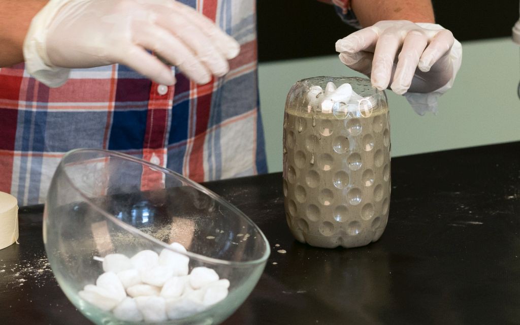 Fot. Ultrament- Do butelki wlej masę betonową, a następnie włóż szklankę z tworzywa sztucznego, której zewnętrzne ścianki zabezpiecz olejem kuchennym. Upewnij się, że beton dokładnie pokrył całą przestrzeń pomiędzy ściankami butelki i szklanki.