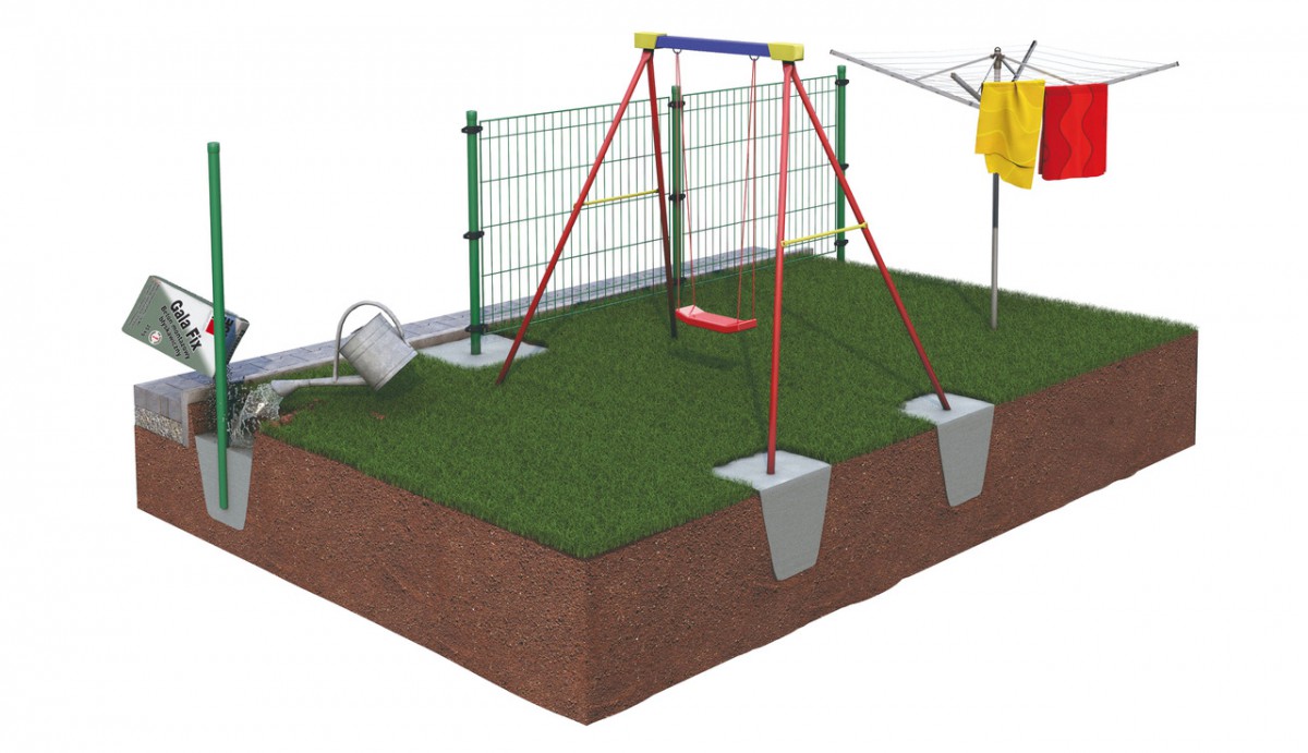 Jeśli chcemy zamocować elementy w gruncie, zacznijmy od przygotowania pod nie wykopu, zwracają uwagę na jego wymiary. Te bowiem powinny być min. 20-30 cm większe we wszystkich kierunkach niż wymiary samego elementu kotwionego. Po zwilżeniu wykopu wodą, możemy rozpocząć wsypywanie mieszanki betonowej. Robimy to 10-centymetrowymi warstwami, aż osiągniemy pożądaną grubość. Każdą z nich polewamy odpowiednią ilością wody (możemy użyć konewki ogrodowej) i czekamy ok. 1 minuty do jej całkowitego wchłonięcia. Na koniec warstwę wierzchnią możemy wyrównać np. kielnią. Zaprawa bardzo szybko wiąże (po ok. 5 minutach od zalania mieszanki wodą), dlatego w trakcie montażu należy kontrolować położenie osadzanego elementu. Jego lekkie obciążanie jest możliwe po ok. 30 minutach, natomiast po ok. 48 godzinach beton osiąga pełną wytrzymałość.