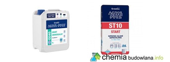 - Gładź: ACRYL-PUTZ® ST10 START gładź szpachlowa 2 W 1 (START+FINISZ) to śnieżnobiała gładź szpachlowa doskonale przyczepna do podłoża. Nie wykazuje skurczu, wysycha w krótkim czasie, nie pęka nawet przy grubych warstwach (do 3 cm przy pojedynczych ubytkach), łatwo się szlifuje. Dzięki nowoczesnej formule może być stosowana jako warstwa wierzchnia bez konieczności użycia gotowych gładzi szpachlowych. Polecana do prac wykończeniowych i remontowych wewnątrz pomieszczeń. Dostępna w opakowaniach o pojemności 2,5 kg, 5 kg oraz 20 kg.