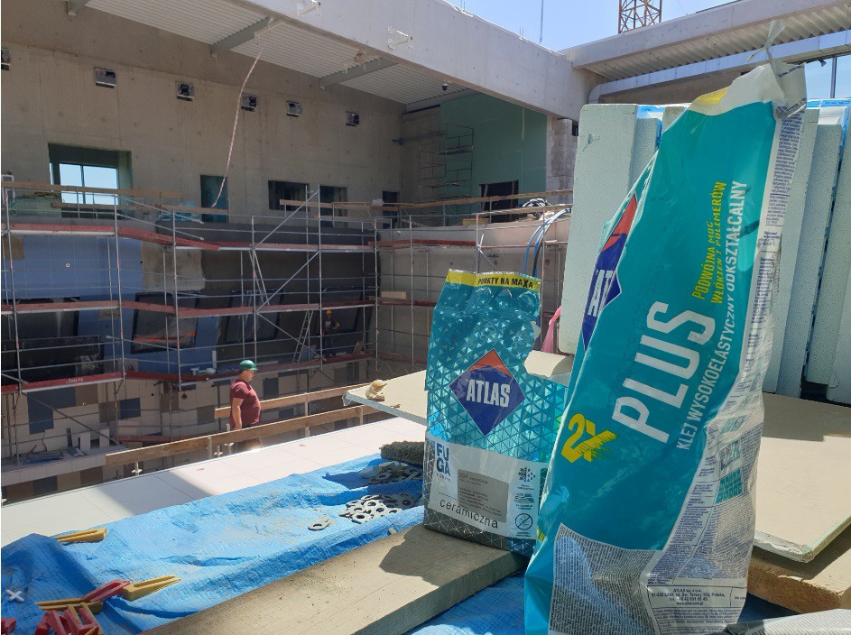 Fot. AtlasNajwiększym wyzwaniem stojącym przed wykonawcą jest ułożenie okładzin ceramicznych w tubie o wysokości 25 m i średnicy 7 m. Z uwagi na jej usytuowanie i ograniczenia w komunikacji, na dnie tuby zastosowano tzw. materiały szybkie, m.in. nowy produkt ATLAS, tj. szybkowiążący żelowy klej wysokoelastyczny GEOFLEX EXPRESS. Gresowe okładziny na ścianach bocznych, w zależności od głębokości, przyklejone zostały z wykorzystaniem wysokoelastycznych i odkształcalnych klejów: żelowego GEOFLEX ULTRA i ATLAS PLUS. W przypadku spoiny wybór mógł być tylko jeden: ATLAS FUGA CERAMICZNA. Produkt ten wyróżnia się parametrami, które bez obaw o jakość i trwałość (m.in. eliminacja mikrorys i spękań, przebarwień i wykwitów) pozwalają zastosować go w tak trudnym, jak niecka basenu, środowisku.