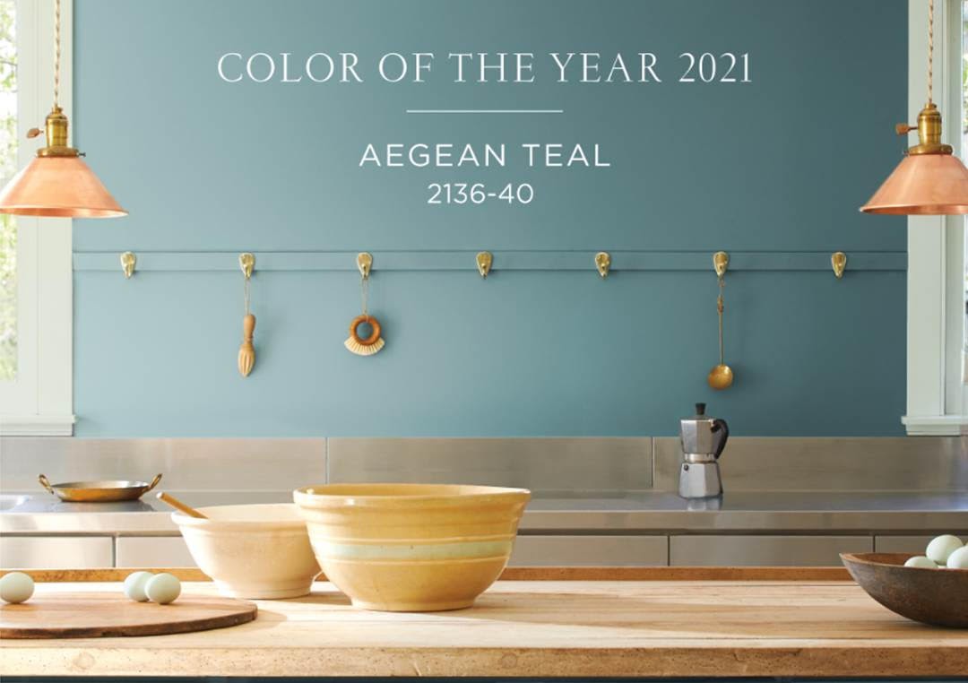 Bohater roku 2021 Benjamin Moore – „Aegean Teal 2136-40” to zrównoważony kolor o średnim nasyceniu, wywodzący się z szerokiej gamy odcieni składowych otaczającego środowiska. Według Andrea Magno, Director of Color Marketing and Development koncernu Benjamin Moore & Co., harmonijne połączenie niebiesko-zielonego i szarego koloru inspirowane było występującymi wokół nas kolorami oraz wywoływanymi przez nie emocjami. „Skupiamy się na kojących, rozświetlonych słońcem barwach, które tworzą emocjonalną więź z naszym otoczeniem” - wyjaśnia Andrea. Atrakcyjność koloru roku Aegean Teal w dużej mierze polega na jego wszechstronności. Nie jest to "krzyczący odcień”, ale wyjątkowy kolor doskonały do wykończenia ścian ale również drzwi wejściowych, stolarki oraz mebli. Aegean Teal uzupełnia i wzmacnia pozostałe kolory z palety Color Trends 2021, łącząc ciepłe i chłodne odcienie z harmonijną naturą