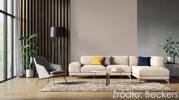Również nieco ciemniejsze, bardziej nasycone beże, będą inspiracyjną bazą w kreowaniu łagodnych, a jednocześnie designerskich aranżacji. Jedna z nowości, ciepły odcień Mocha, bezbłędnie zagra także jako element łączący szarą część ściany z fragmentem wykończonym ciemnym, ozdobnym drewnem. By uwypuklić nowatorski charakter aranżacji, do takiego wnętrza warto wprowadzić też zdecydowany jasny akcent w postaci sofy oraz kilka kontrastujących kropli kolorystycznych - barwnych poduszek czy ożywczych kwiatów doniczkowych.