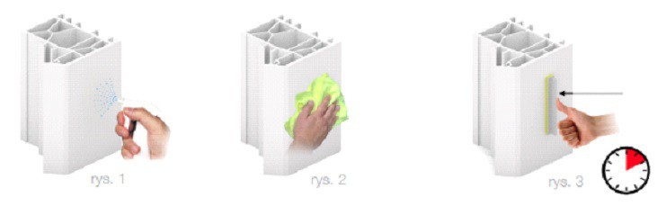 Próbę taką należy wykonać w niewidocznym miejscu na odpylonej i odtłuszczonej wcześniej powierzchni stolarki otworowej. Podłoże należy wyczyścić (w porozumieniu z producentem profilu i/lub stolarki otworowej) - rysunek 1 i 2 a następnie nakleić profil o długości około 10 cm, który należy mocno docisnąć i odczekać co najmniej 10 minut - rysunek 3.