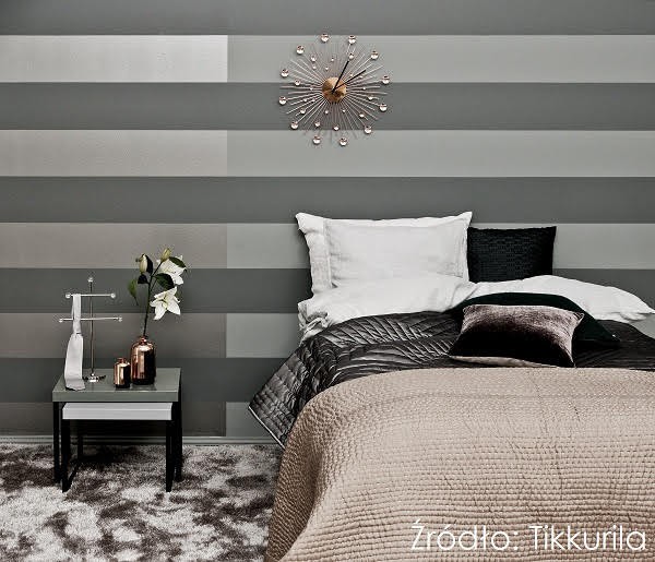 Fot. TikkurilaWykorzystanie różnych odcieni szarości jest sprawdzonym sposobem na aranżację eleganckiego wnętrza. Klasyczne pasy zyskają niezwykłe oblicze, jeśli do ich stworzenia użyjemy farb w różnych stopniach połysku. Połączenie perłowej farby Tikkurila Taika Pearl Paint w odcieniu 2077 HM Uranus z matową farbą Tikkurila Optiva Matt 5 w kolorach 1944 i 1947 będzie prezentować się wyjątkowo pięknie. Powstanie w ten sposób urzekająca ściana, która sprawdzi się i w sypialni, i jako ozdoba salonu. Matowej ścianie w odcieniu K487 Calcite można dodać artystycznego sznytu malując jej część w nieoczywisty, niby bezładny sposób z wykorzystaniem opalizującej farby Tikkurila Taika Paint Pearl w odcieniu 2027 HM Deimus. Jeśli wnętrze dodatkowo ozdobimy metalizującymi meblami czy rzeźbami, możemy stworzyć w salonie aranżację na miarę galerii sztuki. Pozyskanie takich eksponatów wcale nie musi być trudne ani kosztowne – drewniane taborety czy dekoracje ścienne wystarczy pokryć tą samą perłową farbą w różnych odcieniach, np. zieleni 2025 Galatea KM, granacie 2022 Hyperion HM, różu 2033 Cressida KM czy turkusie 2023 Calypso HM. Zapewnią one dekorację zachwycającą spójnością i oryginalnością.