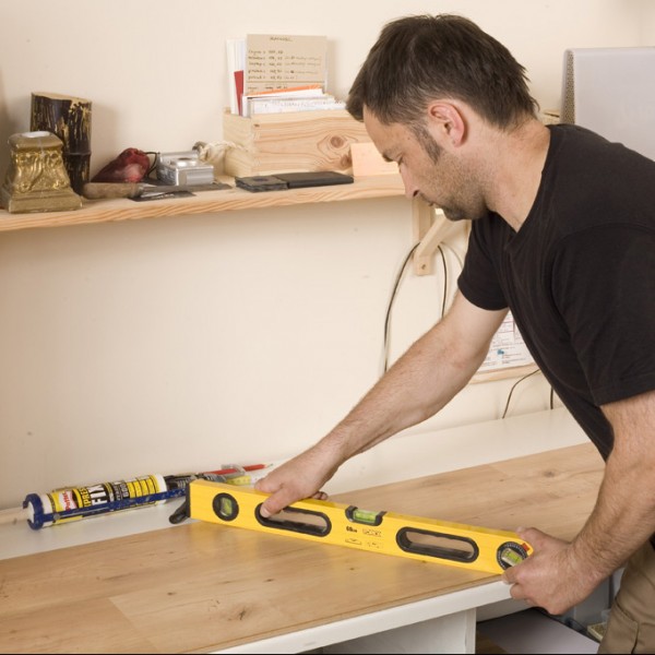 Na podobnej zasadzie jak przegrodę konstruujemy blat naszego kącika. Istniejący stary blat pogrubiamy i wzmacniamy płytą laminowaną, a następnie wykańczamy, mocując do niej panele. Poziomica służy tylko do dociśnięcia klejonych elementów.
