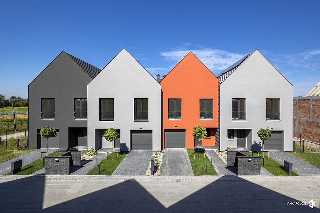Architekci zaprojektowali domy prześwietlone przód-tył, natomiast zarówno elewacja od opaski żwirowej po lewej stronie, przez cały grzebień dachów, aż do drugiej strony jest wykończona dachówką ceramiczną. Aby zgubić łączenie materiałów rozedrgano bryły względem siebie. Każdy z domów jest w innym kolorze, który jednoznacznie nawiązuje do barwy dachówki ceramicznej jako wiodącego elementu wizerunku budynku. – Ponieważ od wielu lat staramy się projektować architekturę monochromatyczną z pewnymi akcentami, tutaj również poszliśmy w podobnym kierunku. Bywa, że takim akcentem jest np. drewno. W tym konkretnym przypadku jest nim kolor – konkretnie ceglasty, nawiązujący do pomarańczowej barwy tradycyjnej ceramiki – mówi arch. Maciecj Beczak z pracowni Beczak/Beczak/Architekci, w której powstał projekt osiedla.