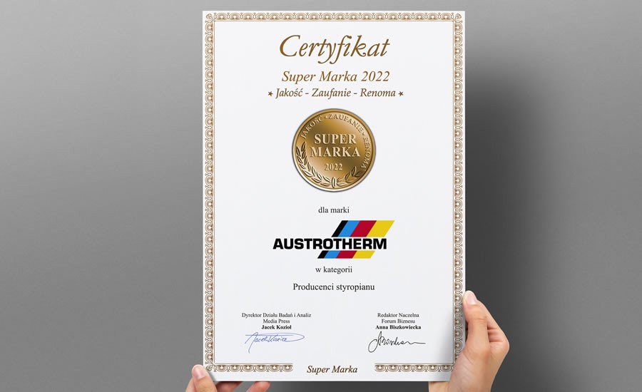 To świetny początek roku dla Austrothermu - lidera termoizolacji. Firma siódmy raz z rzędu została uhonorowana tytułem Super Marka – Jakość, Zaufanie, Renoma w kategorii Producenci styropianu. Wynik badania potwierdza ugruntowaną pozycję oraz doskonałą jakość produktów, cenioną przez najlepszych fachowców.