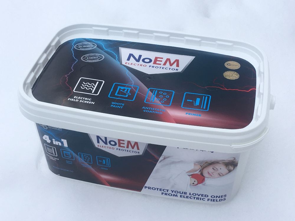 - Farba NoEM Electro Protector jest pierwszą farbą, która położona na ścianę stanowi barierę przed zmiennym polem elektrycznym przez mechanizm związany z dużą stratnością dielektryczną kompozytu. Przepuszcza stałe naturalne pole elektryczne ziemi, nie jest klatką Faradaya, nie wymaga uziemienia, jest tak skomponowana, że nie zakłóca sygnałów informatycznych niesionych na w.cz. typu Wi-Fi (2,5 GHz).