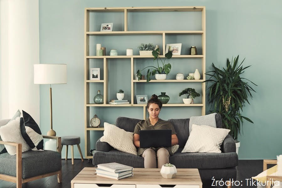 Fot. TikkurilaCzasem nawet niepozorny stolik z odpowiednio wysmakowanymi dodatkami da nam namiastkę własnego gabinetu. Na tle ściany pomalowanej farbą Tikkurila Optiva Ceramic Super Matt 3 w głębokim odcieniu L429 będzie prezentować się jeszcze bardziej imponująco. Całość połączona ze szkłem i kilkoma pozłacanymi detalami sprawi, że wnętrze będzie wydawać się wyjątkowo eleganckie i szykowne. Jeśli warunki domowe nie pozwalają na stworzenie kącika do pracy i musimy wykonywać ją z własnej kanapy, to warto zadbać o ergonomię. Podkładka pod laptopa, a także poduszki pod plecy i kolana zapewnią komfort i wygodę. W trosce o zdrowy kręgosłup dobrze jest również zastanowić się nad alternatywnymi miejscami do siedzenia, a także co jakiś czas zmienić pozycję i wykonać kilka prostych ćwiczeń odciążających plecy. Kojąca zieleń H441 z palety Tikkurila Optiva Nature 5 na ścianie da natomiast odpocząć zmęczonym przy pracy oczom i obniży stres.