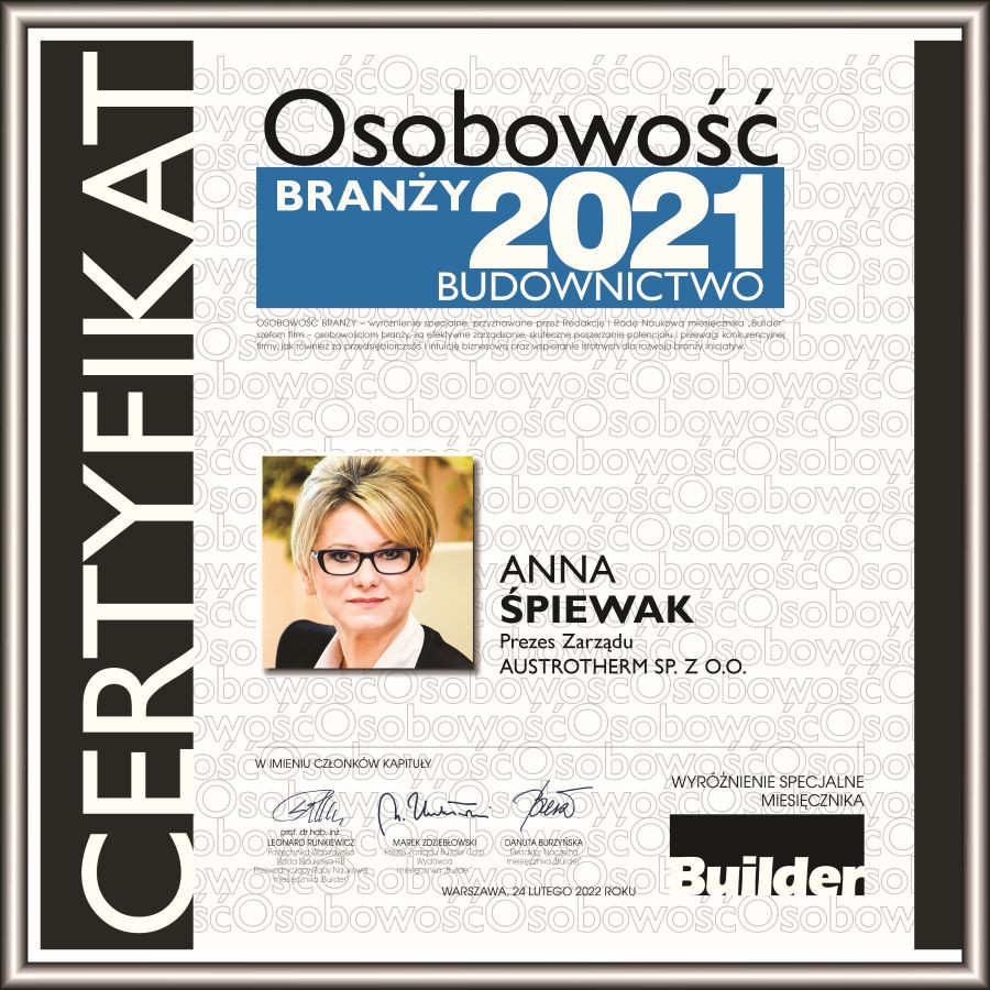 W ramach konkursu Builder Awards przyznano również wyróżnienia specjalne szefom nagrodzonych firm, uwzględniając ich efektywne zarządzanie, skuteczne poszerzanie potencjału przedsiębiorstw oraz intuicję biznesową. Nagrodzone Osobowości, jak prezes zarządu Austrotherm Anna Śpiewak, są związane ze swoimi markami i firmami od początku ich działalności, są doświadczonymi managerami z wieloletnim stażem oraz osiągnięciami, które predestynują ich do miana osobowości dekady, a często nawet dwudziestolecia.