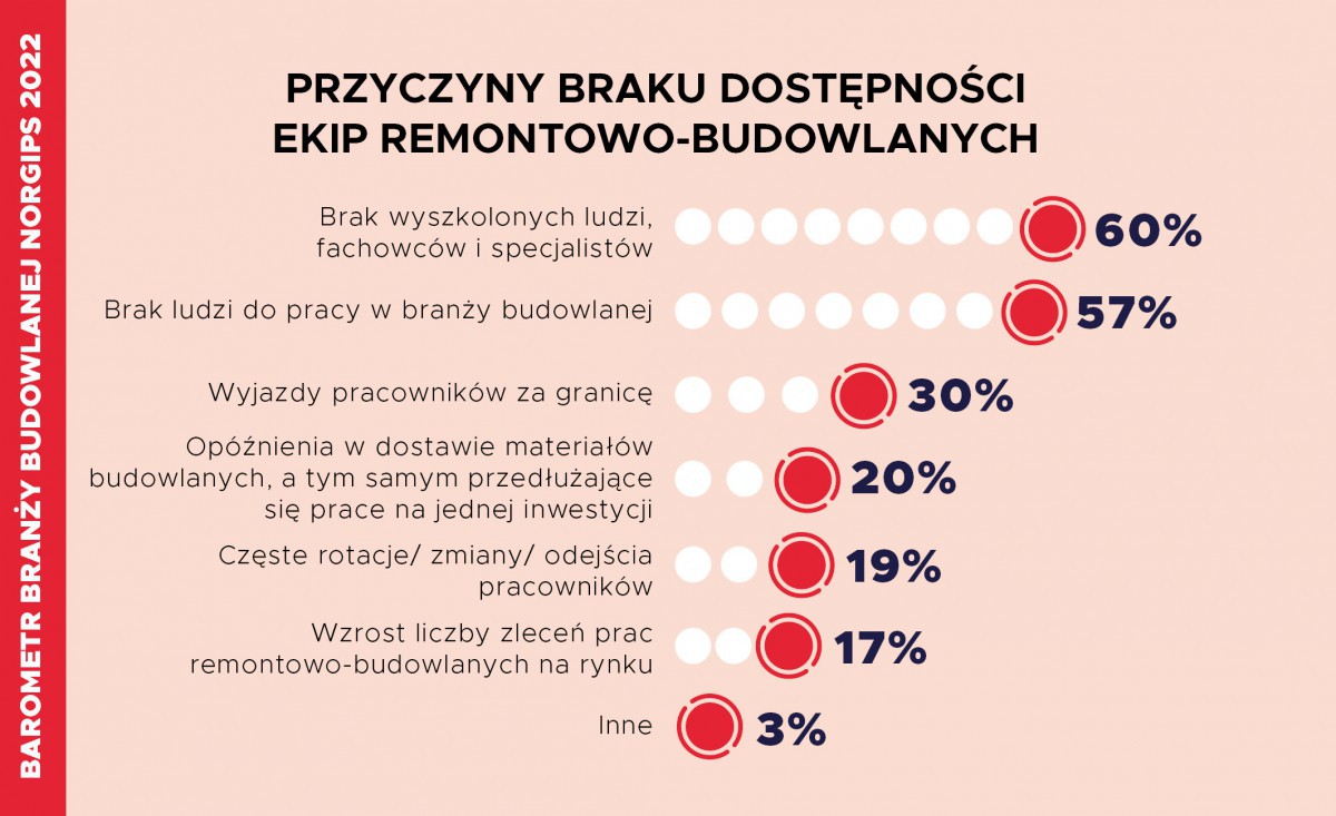 - Na pytanie o przyczyny braku dostępności ekip budowlanych najczęstszą odpowiedzią był brak wyszkolonych fachowców i specjalistów (tak uznało 60% badanych) - tłumaczy Magdalena Wypych, Norgips - a także generalnie występujący ogromny deficyt pracowników (57%). Jednym z powodów jest brak młodych osób, które wchodziłyby do zawodu. Innym także to, że fachowcy wyjeżdżają z Polski, jak twierdzi 30% badanych.