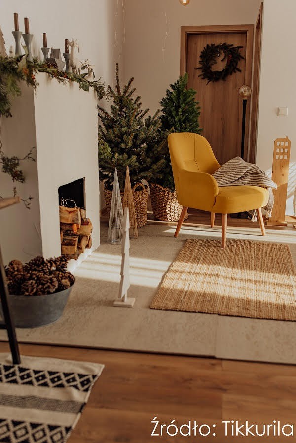 Salon utrzymany w naturalnej stylistyce, gdzie jasne ściany pomalowane ekologiczną farbą Tikkurila Optiva Nature w odcieniu F485 Damask harmonijnie łączą się z dekoracjami z drewna i traw, a główny akcent kolorystyczny stanowi pluszowy fotel w słonecznym żółtym odcieniu, w okresie świątecznym nie musi tracić swego ekologicznego ducha. Choinki w donicach osłonięte plecionymi ze słomy koszykami będą prezentować się wyjątkowo piękne nawet bez dodatkowych ozdób. Stworzą przy tym spójną kompozycję z naturalną girlandą położoną na kominku i niezwykle klimatyczną ekologiczną dekoracją w formie sosnowych szyszek ułożonych w metalowej misie. Ustawione obok drewniane i metalowe choinki oraz świeczniki dopełnią przemyślanego charakteru świątecznej stylizacji.