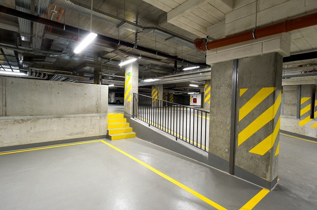 Posadzki żywiczne Deckshield na parkingu w inwestycji Osiedle Bokserska wykonała firma Dal-Lickiewicz sj Posadzki Przemysłowe z Warszawy, autoryzowany wykonawca Flowcrete.