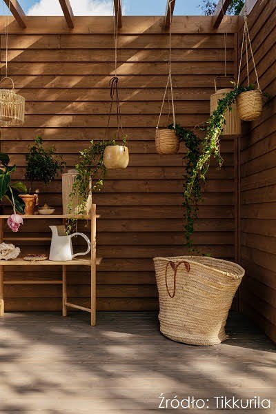 Fot. TikkurilatSposobem na zaaranżowanie wnętrza w stylu bliskim przyrodzie jest wykorzystywanie mebli z naturalnych materiałów. Te z niebarwionego jasnego drewna będą zachwycać swoją delikatnością, wprowadzając do pomieszczenia nieformalny szyk. Fotele z bawełny, pleciona ze słomy pufa i jasny dywan świetnie wpiszą się w świetlisty, naturalny styl dekoracyjny. Piękne tło i nutę kolorytu zapewni delikatna szarość ścian 1922 z palety Tikkurila Deco Grey.Z poszanowaniem środowiska naturalnego można także zadbać o estetykę przydomowej przestrzeni. Wybierając produkty do ochrony i dekoracji drewna warto ściągać po te o ekologicznej recepturze jak np. Tikkurila Valtti Plus Terrace Oil. W formule tego oleju, który świetnie sprawdzi się do zabezpieczenia tarasu, 75% całkowitej zawartości węgla organicznego zostało zastąpione składnikami pochodzenia roślinnego, co stanowi 18% w odniesieniu do całkowitego składu produktu.