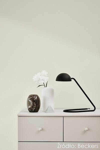 Fot. BeckersCzy można zjeść ciastko i mieć ciastko? Tak! Jeśli ktoś nie jest fanem monochromatyczności, a jednocześnie kocha jasne wnętrza, może wykorzystać kilka gadżetów, które mimo kontrastowego koloru nie zdominują całości. Efekt świetlistości w pomieszczeniu zapewnią ściany pomalowane ciepłym odcieniem Straw z rodziny barw Light Space, jasnoszara podłoga oraz meble w kolorze ecru. W takim otoczeniu dobrze wypadną czarne i brązowe elementy dekoracyjne inspirowane sztuką afrykańską – ciężki, grubo ciosany stolik z drewna oraz artystyczne bibeloty i pamiątki z podróży ustawione na metalowej etażerce.Jasne wnętrze to dokonała przestrzeń dla nowoczesnych, oszczędnych aranżacji, przełamanych kontrastującymi dekoracjami. Na tle głęboko matowej ściany w odcieniu Magic Day z linii farb Beckers Designer Collection wzrok przyciągną ustawione na białej komodzie czarna lampka o niebanalnym stelażu oraz czarno-szary kamienny wazon. Wdzięczną kropką nad i w tym dekoracyjnym minimalizmie będą delikatne, świeże kwiaty.