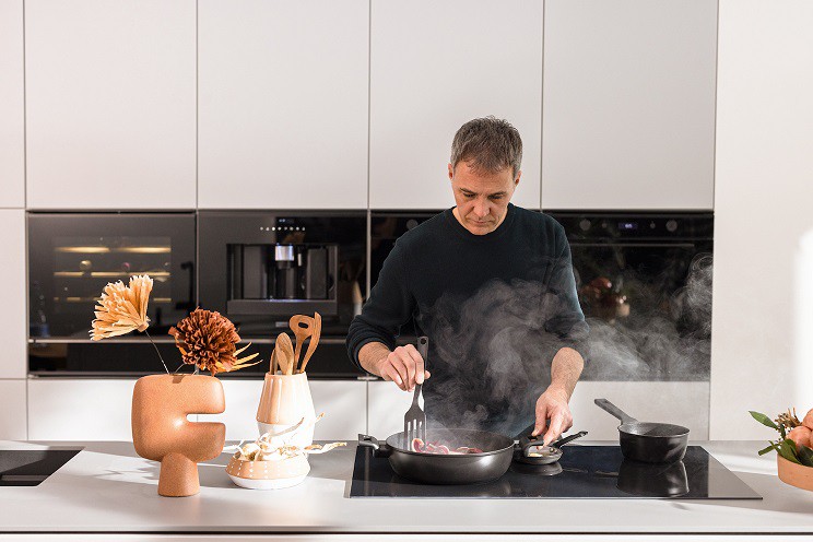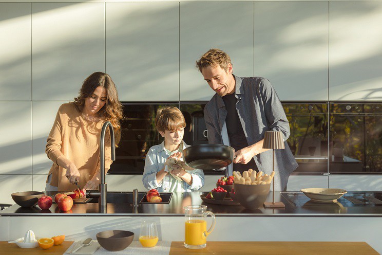 Innym wykończonym w czerni urządzeniem jest płyta indukcyjna Mythos o szerokości 90 cm, wyposażona w funkcje CookAssist, czyli automatyczne programy gotowania, osiem pól grzewczych z możliwością ich łączenia oraz dwa wyświetlacze służące do kontrolowania pracy. Wśród całkowicie czarnych urządzeń znajdziemy również utrzymany w stylu loftowym okap wyspowy Mythos T-Shelf, wyposażony w dwie szklane, przydymione półki na zioła i akcesoria. Natomiast okap ścienny Mythos Vertical ma filtr o wyjątkowo dużej wydajności, a baterię Icon wyróżnia wyrafinowany, prosty kształt. Warto również zwrócić uwagę na zlewozmywaki Kanon i Fresno z czarnego matowego Fragranite, których elementy takie jak maskownice odpływu i przelewu, mają tego samego rodzaju wykończenie.