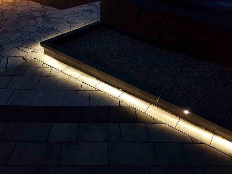 Ciekawym wyjątkiem od tej reguły jest Polbruk Flesz. Na pierwszy rzut oka wygląda tradycyjnie, podobnie jak obrzeża Treo, Fem czy Lingo. Ma gładką fakturę i typową dla obrzeży kolorystkę utrzymaną w kolorze brązowym, grafitowym i stalowym, jednak jego cechą wyróżniającą jest kształt. Flesz wygląda niczym odwrócona litera „L”. Nie jest to przypadek, gdyż dzięki temu pod daszkiem możemy bez problemu ukryć taśmę LED. Co prawda nie zmienia ona funkcji obrzeży, bo dalej stabilizują one nawierzchnię, odgraniczają ją od zieleni ogrodowej czy zabezpieczają bok skarpy czy schodów, ale daje całkowicie nowe możliwości. Dzięki umieszczeniu taśmy LED pod daszkiem możemy dodać przestrzeni wokół domu niepowtarzalnej magii i uroku. Z pomocą światła, które emitują diody LED, podświetlimy ścieżki, krawędź tarasu czy podjazdu w dowolny sposób i w wybranym przez nas kolorze o określonej intensywności. Niewątpliwym atutem tego rozwiązania jest również poprawa bezpieczeństwa, gdy poruszamy się w nocy po otoczeniu domu. Dzięki podświetleniu obrzeży, krawędzie ścieżek, tarasu czy podjazdu staną się widoczne, co chroni przed przypadkowym upadkiem.