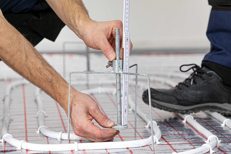 W pomieszczeniu, w którym już wcześniej rozprowadzono instalację ogrzewania podłogowego, należy za pomocą poziomnicy i miarki sprawdzić najniższy i najwyższy punkt podkładu. Kolejny krok to rozstawienie reperów. Ważne, by zacząć od najwyższego punktu i tam ustawić talerzyk repera na wysokość 3,5 cm nad górną krawędzią rurki ogrzewania podłogowego. Rozstaw pomiędzy reperami nie powinien przekraczać 2 m.