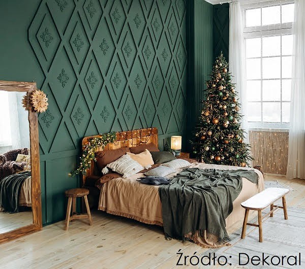 Skąpana w zieleni sypialnia to kolejny sposób, by wykreować piękną świąteczną aranżację. Dekoracyjna ściana pokryta farbą Dekoral Effect 3w1 w kolorze Ciemny Szmaragdowy stworzy wdzięczną scenerię dla żywej choinki, która wypełni dom aromatycznym zapachem lasu i wprowadzi radosną, bożonarodzeniową atmosferę. Naturalnym dopełnieniem będzie drewno i dopasowane kolorystycznie tkaniny, które złożą się na spójną, zachwycającą designem całość.