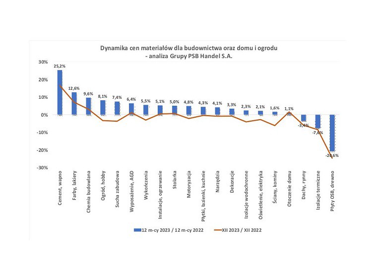 W okresie I-XII 2023 r., w porównaniu z analogicznym okresem 2022 r., ceny wzrosły w 17 grupach towarowych: z największym wzrostem w cementach, wapnie (+25%) oraz farbach, lakierach (+13%). Inne grupy plasowały się następująco: chemia budowlana (+10%), ogród i hobby (+8%), sucha zabudowa (+7%), wyposażenie, AGD (+6%), wykończenia (+6%), instalacje, ogrzewanie (+5%), stolarka (+5%), motoryzacja (+5%), płytki, łazienki, kuchnie (+4%), narzędzia (+4%), dekoracje (+3%), izolacje wodochronne (+2%), oświetlenie, elektryka (+2%), ściany, kominy (+2%), oraz otoczenie domu (+1%).