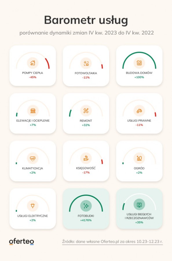 „Barometr Usług” powstał w oparciu o dane Oferteo pozyskane na podstawie liczby zapytań użytkowników platformy. Dane procentowe przedstawiają dynamikę zmian w IV kwartale 2023 roku dla dziesięciu najpopularniejszych kategorii dostępnych na platformie.