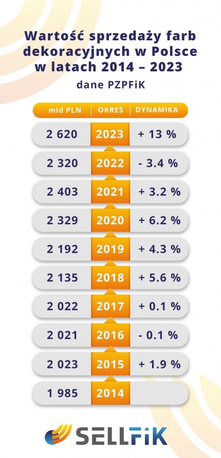W 2023 roku branża farb dekoracyjnych utrzymała dodatni wynik finansowy pomimo spadku wolumenu sprzedanych farb. Wartość sprzedaży farb dekoracyjnych – stanowiących największy segment rynku – wzrosła r/r. o 13%, do 2,62 mld PLN w 2023 r. (w roku 2022 dynamika była ujemna i wyniosła -3,4%). Jednocześnie zmniejszył się wolumen sprzedanych farb liczony w litrach o -2% w 2023 r. (w 2022 r. było to -16.9%). Wyniki powstały na bazie raportu SellFiK przygotowanego dla Polskiego Związku Producentów Farb i Klejów.