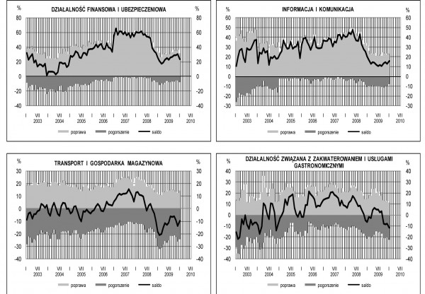 Wynika to z pogorszenia negatywnych ocen bieżących i przewidywań dotyczących popytu, sprzedaży oraz sytuacji finansowej. Odnotowuje się niewielki wzrost bieżących cen, w najbliższych miesiącach mogą one rosnąć szybciej, niż wskazywała prognoza z grudnia. Przewidywana redukcja zatrudnienia może być nieco większa niż prognozowano przed miesiącem. Odsetek przedsiębiorstw nie odczuwających żadnych barier w prowadzeniu działalności kształtuje się na poziomie 2,8% (6,7% w grudniu 2009 r., 9,6% w styczniu przed rokiem). Największe trudności napotykane przez jednostki zgłaszające bariery związane są z kosztami zatrudnienia (55% w styczniu, 61% w grudniu 2009 r., 63% przed rokiem) oraz niedostatecznym popytem (49% w styczniu, 52% w grudniu 2009 r. i 45% przed rokiem). W ciągu roku najbardziej zmniejszyło się znaczenie bariery związanej z konkurencją firm krajowych (z 48% do 34%).