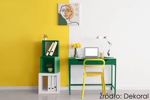 Fot. DekoralWnętrzu skąpanemu w ciemnym błękicie oraz intensywnym odcieniu Żółty Złocisty farby Dekoral Effect 3in1 nie można odmówić świeżości oraz ciekawej estetyki. Mariaż tych wyraźnie odcinających się od siebie kolorów już od progu przywodzi na myśl wakacyjny krajobraz, nawiązujący do morskich fal i ciepłych promieni słońca. Wizualnej lekkości aranżacji nadają biała sofa i naturalne drewno, które jednocześnie bezbłędnie wpisują się w swobodny klimat wnętrza.Kontrasty można wprowadzić nie tylko w różnych kolorach ścian, ale też poprzez zestawienie ich ze zdecydowanymi tonacjami mebli. Biurko pomalowane uniwersalną emalią Dekoral Express Top w odcieniu Zielone Pojęcie efektownie komponuje się z żółtym krzesłem, które w połączeniu z bielą i słonecznym żółtym na ścianie tworzą niezwykle rześki look. Dopasowane kolorystycznie do wystroju kubiki, zachwycają prostotą i nowoczesnym designem, tworząc ciekawy w formie regał.